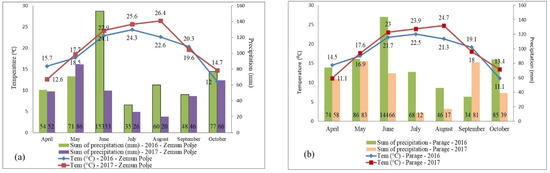 (a) Temperature and precipitation data in 2016 (Y1) and 2017 (Y2) in the location of Zemun Polje (L1); (b) Temperature and precipitation data in 2016 (Y1) and 2017 (Y2) in location of Parage (L2).