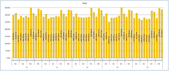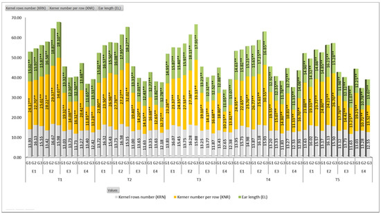 The maize yield depends on the morphological properties of kernels and ears, as well as on their stability and the relationship with environmental conditions [43,44]. The kernel row number, kernel number per row and the ear length are some of properties of yield components, the variability of which leads to a decrease or increase in total and kernel weight [45,46]. The results show that when these traits were expressed, different interactions occurred to different extents due to actions of factors (Table S5). The actions of genotypes, ecological factors, treatments and their interactions significantly affected variations in KNR and EL. With regard to the increase of quantitative values of KNR and EL, the variation in all GT combinations under the effects of E1 and E2 was significant. KNR and EL gradually increased from G1 to G3. This linearity repeated up to the T4 treatment. The application of the T5 treatment changed effects of factors, first of all, ecological impacts (E), and therewith the direction of changes of means (Figure 2). The climate changes are most noticeable in temperature oscillations, which lead to the change in the duration of the growing season, which greatly affects the environment, genetic and physiological processes and the limitation of effects of yield components [47].