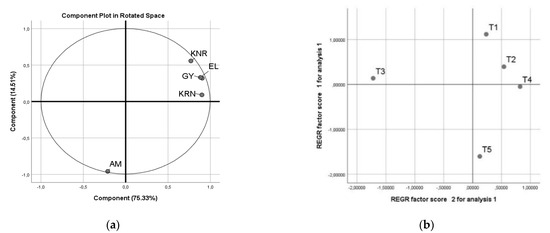 Two most important factors affecting the variability of morphological traits and grain yield were singled out by the factorial analysis. The PCA analysis shows that two components represented 88.84% of the variation obtained (Figure 4a). According to the distribution of means, two groups of properties were differentiated: KNR, KRN EL and GY on one hand and KW on the other. As much as 75.33% of variability of morphological traits was influenced by the applied T1, T2, T3 and T4 defoliation treatments. By observing the distribution of regression factor score values (Figure 4b) of the research variant of defoliation, it was determined that most of the coefficients were located on the right side of the diagram as well as the component matrix of morphological properties (Figure 4b). It can be concluded that the first component was a set of cropping practices that determined the formation of morphological properties and yield. The second factor affected KW with 14.51% and high negative regression score values. The significant loss of KW occurred when four leaves (T5) were removed in the process of defoliation.