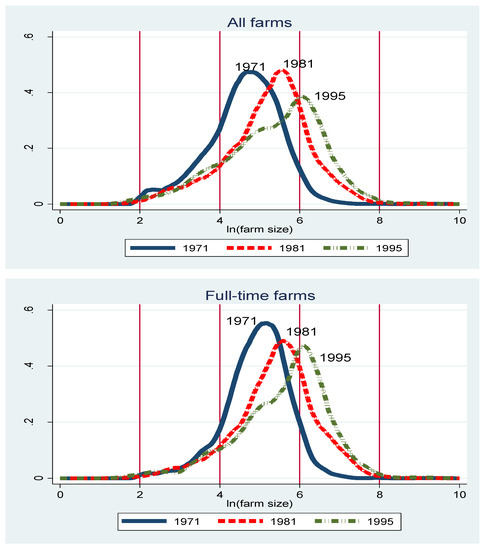 The limitation of this line of literature is the reliance on a parametric regression model that allows for a limited class of distributional changes. Two alternatives have been proposed in the literature. Chavas and Magand [20] and Zepeda [21] used a Markov analysis to estimate transition probabilities between size classes. Alternatively, Kostov et al. [22] and Bakucs and Fertő [14] estimated the farm growth equation by quantile regression, thereby allowing different growth rates in different parts of the size distribution. These methods allow for more flexible changes in farm growth rates across the farm size distribution. Still, they do not capture the entire change in the farm size distribution over time.
