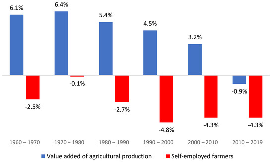 Changes in the value added of agricultural production and the number of self-employed farmers (percent).