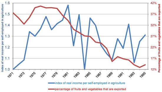 Not surprisingly, the number of farms, which was already decreasing gradually, took a dive after 1985, reaching a record of almost 5% decline annually in the 1990s, and the rate of growth of agricultural value added, which reached a peak of 6.4% annually during the 1970s, and declined gradually over the years to a record low of −0.9% in the last decade (Figure 2). Figure 2 also highlights the difference between the first period of our analysis, 1971 to 1981, with high output growth and almost no exit from farming, and the second period, 1981 to 1995, with much lower output growth and rapid exit of farmers. Other differences between the two periods are worth mentioning. Figure 3 shows that agricultural income per farmer increased more than 50% in real terms between 1971 and 1981, and started declining afterwards, while also exhibiting large fluctuations. This explains the increase in farm exits during the second period. Additionally, farm exports of fruits and vegetables, which ranged between 32% and 40% of the production of these crops during the first period, dropped during the second period to a low of 13%. This is one of the causes of the decline in farmers’ income.