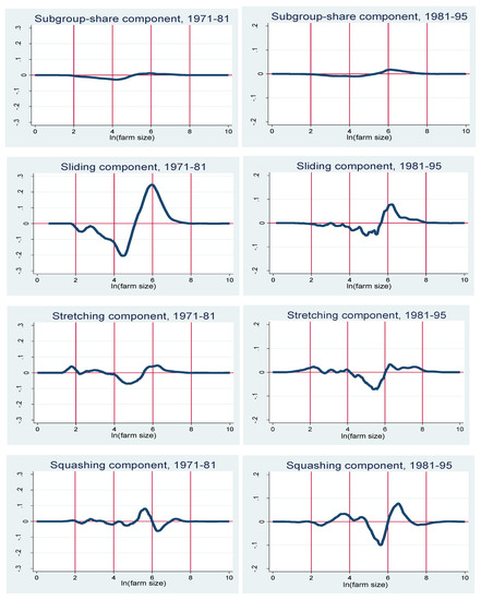 Following Jenkins and van Kerm (2005), we now move to further decompose the change in subgroup densities into three components: sliding, stretching and squashing. Sliding reflects a horizontal shift of the entire density function. Stretching reflects an increase in the spread of the density without changing the mean. Squashing reflects all other changes in the density function, holding the mean and the spread constant. We begin by assuming the existence of a subgroup-specific function (gk) that describes end-period farm size (x1) as a function of beginning-period farm size (x0): . Using the inverse of gk, we can express the end-period density as: