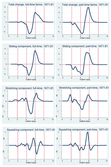 The remaining panels show the relative importance of the different components of the distributional changes, in each sub-period. The first observation is that the component of the share of each subgroup in the farm population is negligible. This implies that farm size transitions are driven by factors other than farms changing from full-time to part-time or the other way around. Secondly, we can see that between 1971 and 1981, the sliding component is very similar in shape to the overall change, indicating that the remaining two components are (jointly) much less important in this case. Specifically, we observe that in the 1971 to 1981 period, the stretching component and the squashing component have considerably lower magnitudes compared to the sliding component, and they also effectively cancel each other out in most ranges of the farm size distribution.