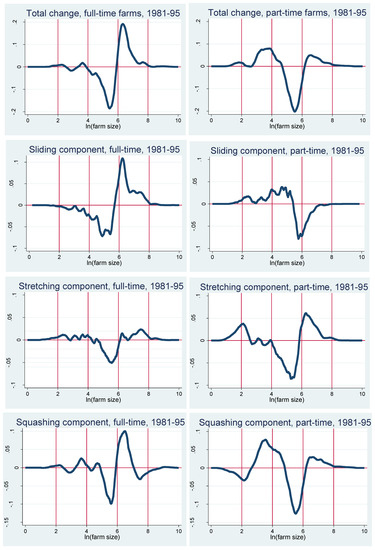 Figure 5 and Figure 6 separate the components of the decomposition into the contributions of full-time farms and part-time farms. In Figure 5, we can see that the dominant sliding components of the distributional change between 1971 and 1981 are not very different for full-time and part-time farms, although for part-time farms the changes due to sliding seem to be spread relatively more evenly along the range of farm sizes. The same is true for the stretching components. However, in Figure 6, we can see that the different components of the distributional changes between 1981 and 1995 are quite different for full- and part-time farms. In particular, the top panel shows that while it is quite clear that the average size of full-time farms has increased during the period, we observe a “disappearing middle” among part-time farms; i.e., the size distribution of part-time farms became flatter between 1981 and 1995, confirming our earlier conclusion from Figure 1. The sliding component and the squashing component seem to be responsible for most of the increase in the average size of full-time farms, while for part-time farms, the sliding component and the squashing component seem to reflect a decrease in farm size and the stretching component seems to reflect the “disappearing middle” phenomenon.