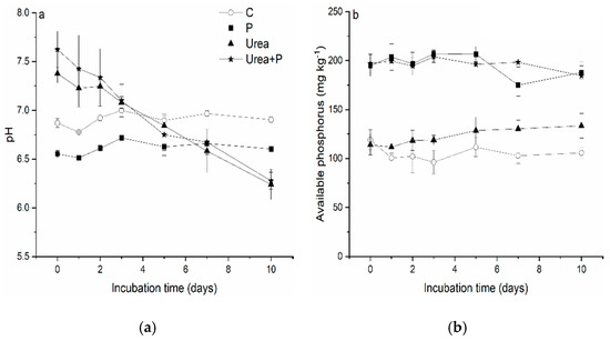 Soil pH in control was stable at around seven during the incubation study (Figure 1a). A slight decrease in pH (p ≤ 0.05) to ~6.6 was observed after the addition of monopotassium phosphate. This was due to exchangeable protons being displaced with potassium ion. In the urea-added soils (“urea only” or “urea plus P”), pH initially increased by ~0.5–0.7 as compared to that of the control (Figure 1a, Table S1). In these soils, pH decreased to ~6.25 at the end of the incubation. Overall, a relatively higher pH value within the first three days and a lower pH value during days five to ten both in the soil amended with urea, and with urea plus P compared to that of the control, were observed. There were no significant differences in pH between urea only and urea plus P treatments.
