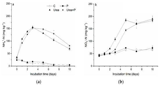 NH4+-N (a) and NO3−-N (b) in soil amended with and without urea, P, and urea + P. Legends correspond to the amendment of urea N (urea, 0.20 g N kg−1soil), monopotassium phosphate (P, 0.087 g P kg−1 soil), urea N and monopotassium phosphate (urea + P, 0.20 g N kg−1 soil + 0.087 g P kg−1 soil). The soil without N and P addition was used as the control (C, control). Three soil samples in each treatment were taken after 0, 1, 2, 3, 5, 7 and 10 days of incubation. Data in the figure represent means ± standard deviations (n = 3).