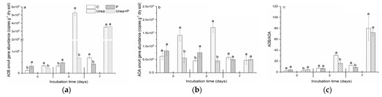 The abundance of the archaeal amoA gene showed no response to P addition at initial time and increased significantly at day 3 as compared to that of the control (Figure 3b). In contrast, archaeal amoA gene number in the soil amended with urea plus P at days 0 and 3 decreased significantly, relative to that of urea-treated soil. At day 7, no significant differences were observed for archaeal amoA gene abundance between C and P, and between urea and urea plus P (Figure 3b).