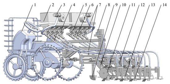 Overall structure of RFW machine. 1. Tractor; 2. Fertilizer box; 3. Fan; 4. Motor; 5. Fertilizer apparatus; 6. Air–fertilizer mixing chamber; 7. Pipe; 8. Height adjustment device; 9. Furrower; 10. Chain transmission box; 11. Weeding wheel; 12. Limiter spring; 13. Fertilizer tank; 14. Depth-limiting plate.