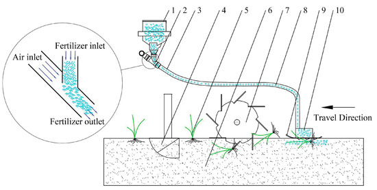 - Shan, Z.; Zhenhui, Z.; Zhou, Y.; Xiwen, L.; Yipeng, T.; Zewen, M. Design and test of airflow layered fertilizer system for rice direct seeder. Trans. Chin. Soc. Agric. Eng. 2020, 36, 1–9. [Google Scholar] [CrossRef]