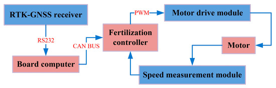 The fertilization control system was designed to improve the uniformity and accuracy of fertilization. The system uses a proportional–integral–derivative (PID) algorithm to achieve closed-loop control of the motor speed. The working principle of the system is shown in Figure 3. First, an RTK-based global navigation satellite system (GNSS) receiver monitors the working speed of the machine in real time and transmits the speed signal to an onboard computer. The desired motor speed is calculated by the computer based on the desired amount of fertilizer and machine parameters, then the desired speed is transmitted to the fertilization controller. The controller generates a pulse-width-modulated (PWM) signal, which is regulated by the PID controller, and the signal is sent to the motor drive module. The motor speed is controlled by changing the output voltage. At the same time, the speed measurement module feeds the actual working speed back to the controller, which alters the duty cycle of the PWM signal based on the above feedback, thereby realizing real-time control of the motor speed and precision fertilization.