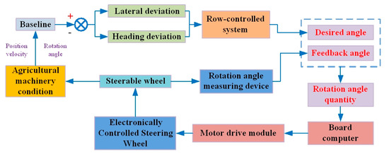 Proper function of the row-controlled system relies on the automatic driving system for agricultural machinery based on BeiDou navigation. The operating principle of the row-controlled system is shown in Figure 4. First, the system reads the original path data for rice seeding and planting, which is used as a baseline for planning the desired path. The lateral and heading deviation are obtained by comparing the real-time position and heading information of the RFW machine with the desired path. Then, the theoretical rotation angle is calculated according to the deviations of the two desired values, within a predetermined error value limit. The actual controlled rotation angle is calculated based on the feedback signal from the rotation angle measuring device [23]. The motor drives the electronically controlled steering wheel, and the rotation angle is controlled to realize accurate row-controlled operation.