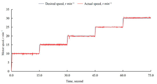 To ensure fertilization uniformity in the longitudinal direction, the fertilization control system should quickly respond to changes in the working speed to ensure the motor speed stabilizes around the desired speed within a relatively short period of time. The motor speed was tested and analyzed under load conditions. In the experiment, the motor speed was programmed to change every 15 s in the range 10–30 r·min−1, and the motor speed data were recorded every 100 ms by the speed measurement module. Finally, the variation of motor speed with load was obtained.
