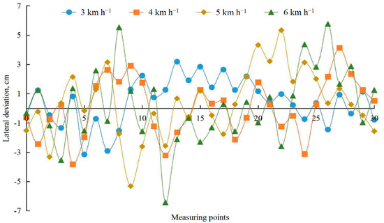 A field experiment was carried out on 28 June 2020 in an experimental field of Jinyun Agricultural Science and Technology Development Co., Ltd., Jiangdu District, Yangzhou City, Jiangsu Province, China (119.512° E, 32.562° N). During the test, the working speed of the machine was set to 3, 4, 5, and 6 km·h−1 and the machine travelled 150 m along the desired path. The actual working path was monitored by a high-precision satellite receiver installed on the longitudinal center line of the machine. Thirty monitoring points were selected along the path. Afterwards, the lateral deviation was calculated. The lateral deviation was taken as the offset distance between the actual working path and the desired path. As the absolute lateral deviation increases, the accuracy of the row-controlled operation decreases.