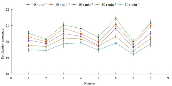 Figure 7 shows the amount of fertilizer applied during a single turn of the fertilizer apparatus at different motor speeds. At a constant motor speed, the amount of fertilizer fluctuates slightly. Overall, the amount of fertilizer was consistent, with a standard deviation of less than 0.52 g. The fluctuation is likely related to differences in the characteristics of different fertilizer distribution apparatuses. Nonetheless, as the speed increased, the amount of fertilizer tended to decrease.
