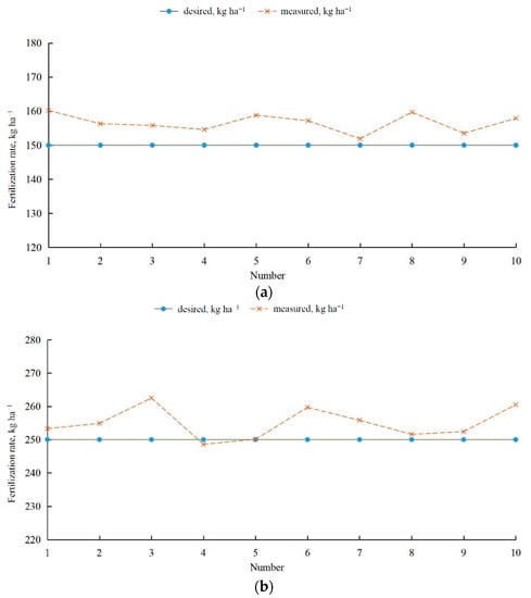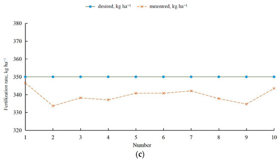 Figure 8 compares the desired and measured fertilization rates for three different target values. When the desired fertilization rate was 150 kg·ha−1, the measured fertilization rate was generally higher than the desired fertilization rate; whereas, when the desired fertilization rate was 350 kg·ha−1, the measured fertilization rate was generally lower. The reason for this may be that at a constant working speed, the motor speed must increase to increase the amount of fertilizer dispensed. However, as the motor speed increases, the amount of fertilizer applied by the fertilizer distribution apparatus during a single turn will decrease, leading to a decrease in fertilization rate, which is consistent with the results presented in Figure 7.
