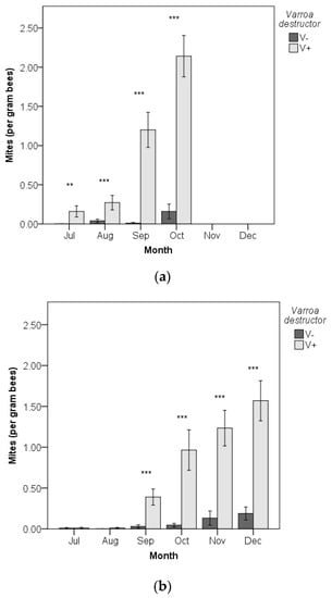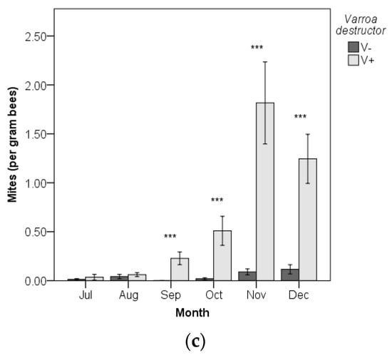Number of V. destructor mites per gram of bees per month in 2012 (a), 2013 (b) and 2014 (c) for colonies without acaricide treatment (V+, dark grey bars) or with acaricide treatment (V−, light grey bars). Asterisks show differences between V− and V+ (* p < 0.05; ** p < 0.01; *** p < 0.001), where the data for the statistical test were Ln-transformed (+0.0005).