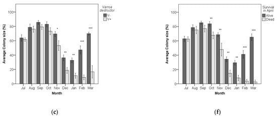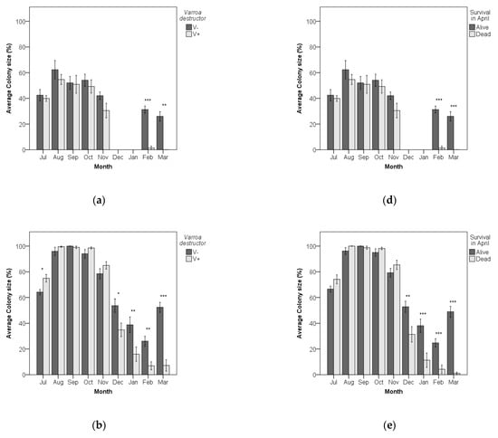 Average colony size (%, [6]) per month for 2012 (a,d), 2013 (b,e), and 2014 (c,f) for colonies with (V−, dark grey bars) or without (V+, light grey bars) acaricide treatment (a–c) or colonies alive (dark grey bars) or dead (light grey bars) in March (e–f). Asterisks show differences between series (* p < 0.05; ** p < 0.01; *** p < 0.001).