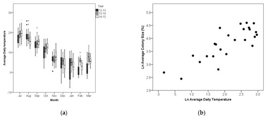 Average daily temperature (°C) per month for 2012, 2013, and 2014 (a) and its relationship with the average colony size per month (%) (b). In panel (b), the Ln-transformed data are shown.