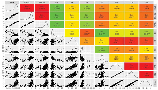 The correlations among the 10 traits evaluated in this study, considering three harvest years, are shown in Figure 1. A total of 42 significant correlations were found (p < 0.05), of which nine were negative and 33 were positive. They were grouped according to the value of correlation among traits: low (≤0.35), moderate (0.36–0.70), and strong (≥0.71) with 14, 17, and 11 correlations classified as low, moderate, and strong, respectively. The SN and FIB traits showed negative correlations with BRIX, POL%C, and POL%J, which are indirectly or directly related to sucrose content. In addition, SN showed a significant negative correlation with SD, while FIB was negatively correlated with SD and TPH. The highest correlations were between BRIX, POL%C, and POL%J traits, and between SW, TCH, and TPH.
