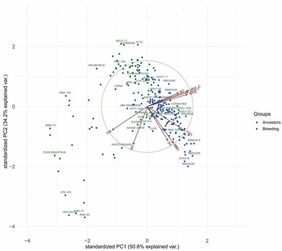 In breeding programs, genotypic correlations can be used to predict the effectiveness of an indirect selection of a trait with the primary goal of improving another trait [62,63]. This is relevant for traits that are difficult to measure or expensive to quantify, or those with low heritability as their covariances with higher heritability traits can be explored [63]. The strong positive (BRIX–POL%C, BRIX–POL%J, POL%C–POL%J, SW–TCH, SW–TPH, and TCH–TPH) and negative (FIB–POL%C, FIB–POL%J, FIB–SD) genotypic correlations (Figure 1) are comparable to previous reports [31,64,65,66] and suggest that BPSG congregate contrasting accessions for sucrose and fiber content. This is also evidence that BPSG has accessions with a genetic base to obtain sugarcane and accessions with favorable alleles for a high biomass energy cane [67,68]. The biplot analysis (Figure 2) showed that ancestors and breeding accessions were grouped based on the breeding and evolutionary history of sugarcane, that is, the ancestor representatives of S. spontaneum, which is known as an allelic reservoir for biomass production and less used in the sugarcane breeding crosses [69,70], were positioned farther from the breeding accessions than representatives of S. officinarum. In addition, the phenotypic averages were in accordance with those reported for sugarcane [14,27,60,65,66,71,72].