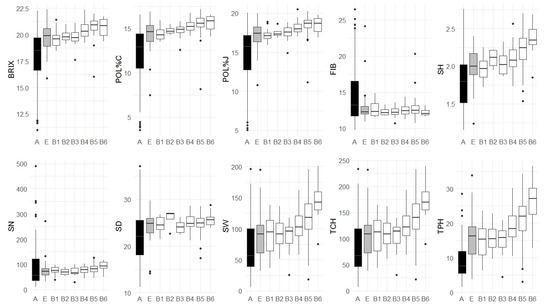 Boxplot analysis of yield traits (BRIX (in °Brix), sucrose content of the cane (POL%C, in %), sucrose content of the juice (POL%J, in %), fiber content (FIB, in %), stalk height (SH, in m), stalk number (SN), stalk diameter (SD, in mm), stalk weight of the plot (SW, in kg), cane yield (TCH, in t/ha), and sucrose yield (TPH, in t/ha)) evaluated in the Brazilian Panel of Sugarcane Genotypes (BPSG). The accessions of BPSG were grouped into A (ancestors), E (foreign breeding accessions), and B (Brazilian breeding accessions). Group B was subdivided according to the decade in which the accession parents were crossed: B1 (1940–1951), B2 (1952–1961), B3 (1962–1971), B4 (1972–1981), B5 (1982–1991), and B6 (1992–2001). The boxplots of A, E, and B (B1, B2, B3, B4, B5, and B6) sets were black, gray, and white, respectively.