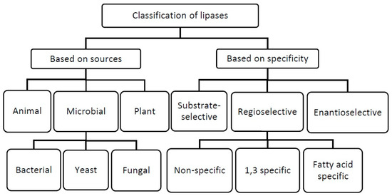 The classification of lipases is based on the sources of these enzymes and their specificity (Figure 2). Lipolytic microorganisms can be found in a variety of oil-contaminated habitats such as soil contaminated with oil, wastes of vegetable oils, dairy waste and deteriorated food [16]. Lipases are widely distributed in animals, plants and microorganisms, where their main role is to metabolize lipids [17]. Animal lipases are extracted, for the most part, from the pancreas of pigs and sheep, but they are also isolated from the liver, stomach and intestinal wall. In plants, lipases are located in seeds and vegetative organs [18]. However, most lipases that are studied and used industrially are obtained from microbial sources, such as bacteria, yeast and fungi, due to their unique properties, such as their superior stability, selectivity and substrate specificity position. Most microbial lipases are glycoproteins and they may be intracellular, extracellular or membrane bound [19]. Lipase selectivity is related to its preference to perform given reactions. The following three types of selectivity can be distinguished: substrateselectivity, regioselectivity and enantioselectivity. The regioselective lipases can be further divided based on their selective functionality, as follows: non-specific lipases, 1,3 specific lipases, and fatty acid-specific lipases. Substrate-specific lipases act selectively on a specific substrate, for example tri-, di- or monoglycerides in a reaction mixture facilitate the synthesis of the desired product. Substrates that can be acted upon by substrate-specific lipases include fatty acids and alcohols [20]. Regioselectivity is defined as the lipase reaction towards a given ester bond in the glycerol backbone of triglycerides, such as the primary or secondary ester bond. Regioselective lipases have the ability to steer the reaction in a favorable direction as compared to other side reactions. This specific property of lipases is important to both the chemical and pharmaceutical industries, such as in the production of isomeric compounds, which show optimal function only under specific configurations. Non-specific lipases catalyze the hydrolysis of triacylglycerols into free fatty acids and glycerol. The 1,3-specific lipases catalyze the hydrolysis of triacylglycerols at the C1 and C3 positions, producing fatty acids, 1,2- or 2,3- diacylglycerols and 2-monoacylglycerols. Fattyacid-specificlipaseshydrolyzeesters, whichhavelong-chainfattyacids with doublebonds on C-9, such as the lipase from Geotrichumcandidum [21]. Enantioselectivity refers to the hydrolysis by lipases of one of the isomers of a racemate over the other from prochiral precursors. Additionally, this type of lipase can differentiate between enantiomers in a racemic mixture [22].