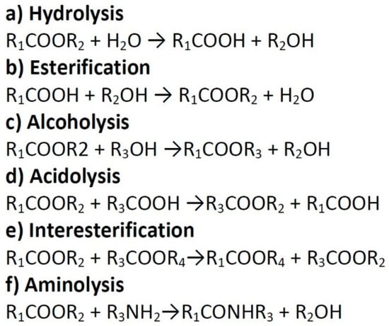 Types of reactions catalyzed by lipases: (a) hydrolysis, (b) esterification, (c) alcoholysis, (d) acidolysis, (e) interesterification, (f) aminolysis [29].