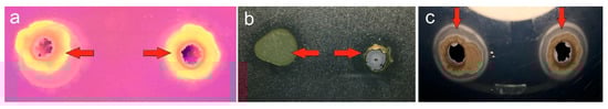 Lipase-producing strains: (a) Yarrowialipolytica ATCC 18942 in olive oil using a rhodamine B agar plate, (b) Burkholderiacepacia DSM 7288 on a tributyrin agar plate, (c) Moesziomycesantarcticus ATCC 28323 on a Tween 80 agar plate.
