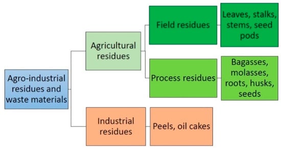 Although commercially available lipases are widely used as biocatalysts, there are still many challenges concerning the production of microbial lipases, with the use of renewable sources as the main component of microbial growth medium such as straw, bran, oil cakes and industrial effluents [17]. Agro-industrial residues and wastes may be divided into two different types, such as agricultural wastes and industrial wastes (Figure 6). Agricultural wastes can be further divided into field residues, which refers to the harvesting of crops and process residues, which corresponds to a harvest that has been further processed into a different raw material. Agricultural wastes include stems, leaves, seed pods, husks, seeds, roots, bagasse and molasses. Industrial wastes mainly consist of the waste produced by the food processing industries, and includes peels, oil cakes and waste water [18]. The food and agricultural industry is expanding rapidly. The rapidly growing population and demand for food has resulted in the amount of agro-industrial residues and wastes increasing each year, and this will lead to serious environmental and economic problems. In response to this fact, one of the most important and urgent challenges is to create new uses for agro-industrial wastes and residues. Additionally, the use of agro-industrial residues and wastes as raw materials can help to reduce production costs and also reduce the pollution load on the environment [69]. Moreover, overproduction, damage during harvesting, infections caused by microbes, insects and pests, postharvest handling, inadequate transport and storage, food processing, improper distribution, and wasteful consumer usage are the main reasons for food wastage [70]. Most residues and wastes generated by the food and agricultural industry are a source of carbohydrates, fat, protein, lignin and cellulose. These ingredients facilitate microbial growth such as bacteria, filamentous fungi and yeast [71]. The composition of selected agro-industrial residues and wastes, employed for the cultivation of microorganisms that can produce lipases, is presented in Table 3. Despite this fact, agro-industrial residues and waste, such as bran, straw, molasses, peels, seeds, pomace, waste water and oil cakes, can be used for the production of various value-added products, for example, for the production of industrially important enzymes such as lipases [72], biofuels [73], antibiotics [74], mushrooms [75] and also various useful chemicals [76].