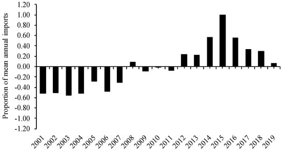 Comparison of imports of pastures and related turfgrass seed expressed as a proportion of the mean of the 19-year period (2698 Mt).