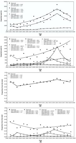 Expressed as a proportion of the 19-year period mean (2698 Mt), the change in total imported seed between 2001 and 2015 ranged from −0.51 to +1.00, with positive proportions in year 2008 and from year 2010 onwards. After the peak in year 2015, the proportion of the mean annual imports decreased to nearly zero (+0.05) in 2019 (Figure 1). In terms of imported Mt of pastures (Table 1), an increasing trend was observed over the 19-year period and a significant AAPC of +5.7% (Table 2). Despite this, the joinpoint regression analysis for the total imported seed (Figure 2a) indicates a change in trend in year 2015, with a significant APC (+10.6%) from year 2001 to 2015, decreasing afterwards.