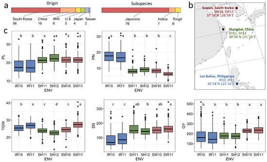 Variation of yield-component traits and grain yield (GY) in different environments. (a) Plant materials used in multiple environment trials. The length of bars indicate the percent of origin or subspecies of plant materials. (b) Locations of experimental cultivation fields: Suwon, temperate; Shanghai, subtropical; and Los Baños, tropical. (c) Comparisons of yield-component traits and grain yield (GY) performance among six environments (three locations over two years). Box plots with different lowercase letters indicate statistically significant differences (one-way analysis of variance (ANOVA) followed by Scheffe’s post hoc test; p < 0.05).