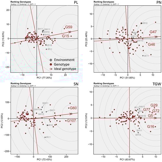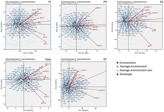 Evaluation of discriminativeness vs. representativeness was performed using GGE biplots (Figure 2). The lengths of environment vectors from the biplot origin are proportional to the standard deviation within each environment and thus represent the discriminating ability of the environments [22]. Tropical conditions (IR10 and IR11) showed the highest discriminating ability for PL, PN, SN, and GY among the six environments (Figure 2). For the term of TGW, discriminating ability was ranked as follows: SH12 > SH11 > SW11 > IR11 > SW10 > IR10. The angle between the environment line and the average-environment axis (AEA), which passes through the average environments and biplot origin, indicates the representativeness of each environment. For PL, SH12 was more representative than the other environments, exhibiting a smaller angle with the AEA line. For PN, temperate conditions (SW10 and SW11) were the most representative, and tropical conditions (IR10 and IR11) were the least representative. For SN, subtropical conditions (SH11 and SH12) were more representative than other conditions. SW10 and IR10 were the most representative for TGW and GY, respectively.