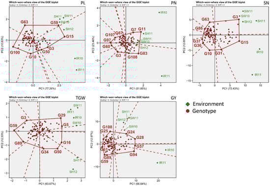 Environments were divided into potential MEs based on ‘which-won-where’ patterns in GGE biplots (Figure 3). A polygon is constructed by connecting the genotypes furthest from the biplot origin by straight lines, and thus all other tested genotypes are contained in the polygon. Perpendicular lines starting from the biplot origin to each side of the polygon divide the biplot into environment sectors [22]. Genotypes were assigned genotype codes to facilitate their visualization in the plot (Table S1). For PL, the six environments were segregated into two MEs, the first containing SW10, SW11, and SH11, and the second containing SH12, IR10, and IR11. G59 was the vertex genotype for the first sector and G3, G15, and G50 were vertex genotypes in the second sector. These results indicated that G59 (Kunmingxiaobaigu) was the winning genotype, exhibiting the longest panicle, for the ME that included SW10, SW11, and SH11. Genotypes G3 (Bluebonnet), G15 (Della), and G50 (IR 8) were the best performing genotypes in the second ME. For PN, the six environments were divided into two MEs. The first ME contained SW10, SW11, SH11, and IR10, and G7 (Cheongan) and G11 (Chucheong) were the best performing genotypes. The second ME included SH12 and IR11, and G83 (Sandeuljinmi) and G108 (Zhendao 88) were the winning genotypes. For SN, G3 (Bluebonnet) and G15 (Della) were the best performing genotypes in the first ME (SW10, SW11, SH11, and SH12) and the second ME (IR10 and IR11), respectively. For TGW, the first ME contained SW10, SW11, IR10, and IR11, and genotypes G5 (Chengcheong) and G29 (Hanmaeum) showed the highest performance. SH11 and SH12 were included in the other ME, and G34 (Hopum) and G50 (IR 8) were the winning genotypes. In multiple environment trials for GY, the six environments were divided into four ME sectors. Two of these MEs represented locations: Shanghai and Suwon. G24 (Gumei 4) and G28 (Hangangchal 1) were the best performing genotypes in the ME containing SW10 and SW11. Genotypes G57 (Keunseom) and G94 (Taichung 178) were the winning genotypes in IR10 and IR11, respectively.