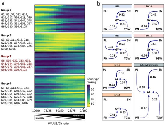 Grain yield performance and stability across all environments. (a) Rank of 89 genotypes according to different weightings of stability and grain yield performance. The order of the genotype codes in each group corresponds to the order of the heatmap (top-to-bottom). (b) Path analyses between yield-related traits and grain yield. Numerical values show standardized path coefficients, and line thickness represents the strength of the direct effect. Individual trials are shown as location-year combinations. IR, IRRI, Los Baños; SH, Shanghai; SW, Suwon. Suffixes 10, 11, and 12 indicate trials in 2010, 2011, and 2012, respectively. PL, panicle length; PN, panicle number; SN, spikelet number per panicle; TGW, thousand-grain weight; GY, grain yield.