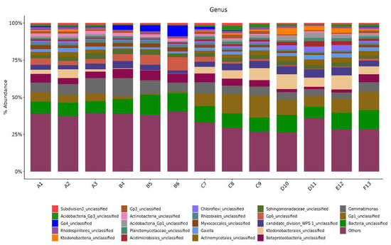 Change in microbial compositionat agenus level. A1–3: Commercial organic fertilizer at 0.75, 1.50, and 2.25 kg/m2; B4–6: mushroom residue at 1.50, 2.25, and 3.00 kg/m2; C7-9: biogas liquid at 150, 225, and 300 kg/m2; D10–11: vegetable cake at 0.30 and 0.60 kg/m2; E12: chemical compound fertilizer (37.50 g/m2); F13: control.