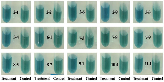 Fifteen P-solubilizing bacterial isolates were picked up from the NBRIP growth medium, which showed a clear halo with a diameter ranging from 4.60 mm to 9.35 mm (Figure 3 and Table 7). Among these isolates, four strains originated from organic fertilizer at 1.50 kg/m2, two strains originated from organic fertilizer at 2.25 kg/m2, one strain originated from mushroom residue at 3.00 kg/m2, three strains originated from biogas liquid at 150 kg/m2, two strains originated from biogas liquid at 225 kg/m2, one strain originated from biogas liquid at 300 kg/m2, one strain originated from vegetable cake at 0.30 kg/m2, and one strain originated from vegetable cake at 0.60 kg/m2. Furthermore, all of the strains, except strains 7-3, 7-8, and 10-4, showed an N-fixation ability, and strains 7-3 and 7-8 originated from the biogas liquid at 150 kg/m2, while strain 10-4 originated from vegetable cake at 0.30 kg/m2 (Table 7 and Figure 4).