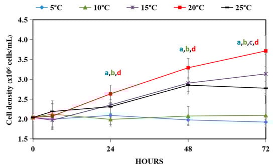 Low temperature can have negative impacts on the growth and productivity of plants and algae [1,2,3]. Compared to plants, little information is known about the physiological responses of microalgae under cold stress. Under 5 °C, no growth was observed as indicated by a flat line (Figure 1). A previous study also found that under this temperature, Chlamydomonas cells did not show a significant increase in cell density but an increase in cell volume was observed [26]. At 10 °C, cells densities were similar to those at 5 °C with slightly higher values at 48 and 72 h. Cells cultivated under 15 °C grew at the same rate as the 25 °C control in the first 48 h. At 72 h, cells under this condition grew slightly but significantly better than the control. Interestingly, the best temperature for growth was at 20 °C where the density was significantly higher than at the 25 °C control at all time points. In terms of biomass productivity, the temperature of 20 °C was best and slightly better than the 25 °C control (Table 1). The temperatures of 10 °C and 15 °C gave similar productivity, which was slightly lower than that of the control. The results are in line with several previous studies in microalgae that have reported optimal growth temperatures in the range of 15 °C–25 °C, while there is a sharp decrease in growth below 10 °C [27,28,29].