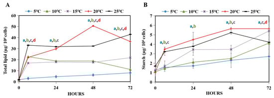 Under abiotic stresses, microalgae accumulate lipids and starch for a storage compound as a crucial part of their survival mechanism [34]. Starch is known as a primary carbon and energy storage [33,35]. It is known to be essential for cell division even in the dark [36]. In this study, both lipids and starch levels were measured over the course of 72 h under hypothermal stress. In the range of 5–15 °C, the lower the temperature, the lower the levels of both compounds observed (Figure 2A,B). At 20 °C, the level of lipids was lower than at 25 °C except at 48 h where the level at 20 °C was significantly higher (Figure 2A). For starch, the level at 20 °C was generally higher than that of the control at 25 °C (Figure 2B). By comparing both lipids and starch, it was clear that starch level showed a greater increase over the course of 72 h. When calculated in terms of productivity over the entire three days, lipid productivity peaked at 25 °C and low temperature decreased its productivity (Table 1). In contrast, the productivity of starch was highest at 20 °C followed by 15 °C. Therefore, cold temperatures increased the accumulation of starch but decreased total lipid accumulation.