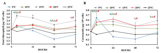 Even though algal responses to many abiotic stresses have been reported, cold stress has not been extensively explored in terms of pigment production. From the culture subjected to different cold temperatures, the levels of the main pigments, chlorophyll and carotenoids, were monitored. A sharp decrease in the levels of both pigments was observed in cells grown under 5 °C in the first 48 h, with a slight recovery at 72 h (Figure 3A,B). At 25 °C, the levels of both pigments were stabilized. Interestingly, the level of chlorophyll slightly increased at 10 °C and 20 °C but exhibited a steep increase starting at the first 6 h when cells were subjected to 15 °C treatment (Figure 3A). In the case of carotenoids, a chilling temperature between 10 and 20 °C led to a significant increase in this pigment compared to the control. The productivity of both chlorophyll and carotenoid were best at 15 °C followed by 20 °C (Table 1).
