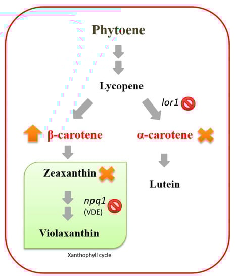 In Chlamydomonas, the two major carotenoids are lutein and β-carotene, which are on the α-branch and the β-branch, respectively [14,21]. β-carotene is a precursor of zeaxanthin, which, together with lutein, has been shown to be essential for high light stress survival [20]. A previously characterized mutant npq1 lor1, which is defective in both lutein and zeaxanthin synthesis (Figure 4) [21], was then employed to investigate the importance of these carotenoids on cold acclimation. Additionally, this mutant accumulated a double level of β-carotene to compensate for the loss of lutein on the α-branch [20,21]. Similar compensation was also shown in the cyanobacterium Synechocystis sp. PCC6803. Deficient in xanthophylls, it increased the content of β-carotene as compensation (Figure 4) [50]. In Arabidopsis lut2 mutants deficient in lutein, a higher accumulation of β-carotene was observed [51]. Therefore, this characteristic makes it an attractive strain for improved β-carotene production.