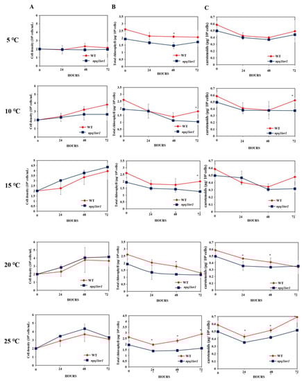 Growth and pigment accumulation were monitored in npq1 lor1 and compared to the WT over the course of 72 h under different temperatures. There was essentially no difference in cell density between the two strains under all temperatures (Figure 5A). In contrast, WT seemed to exhibit higher chlorophyll content under all temperatures, especially at 25 °C where the differences between the two strains were significant at all time points (Figure 5B). Similarly, the carotenoid content of the WT was higher than that of the mutant at 20 °C and at 25 °C, except at 72 h at 20 °C where the content of the two strains were similar (Figure 5C). Interestingly, at lower temperatures of 5 °C, 10 °C, and 15 °C, the carotenoid content of the two strains were similar except at the end of experiment at 10 °C, and at 15 °C where the carotenoid level of the WT was higher than that of the mutant (Figure 5C).