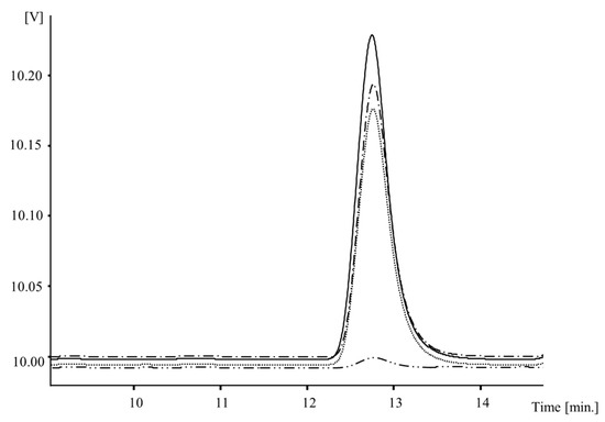 Vitamin D2-enriched extracts chromatogram profile of Agaricus bisporus Portobello (-), white A. bisporus (.-.-) and Pleurotus ostreatus (...) irradiated with UV-C (6 min at 3200 mJ/cm2), and A. bisporus Portobello control samples (..-..-).