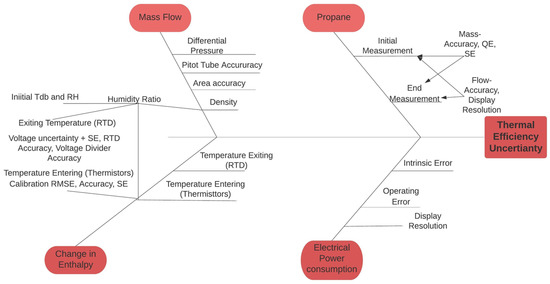 The final standard uncertainty of the thermal efficiency (Δ) was calculated from the standard uncertainty obtained from all key measurement inputs propagated through (Equation (13) through Equation (20), Figure 3).