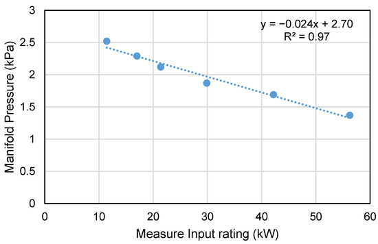 The measured input energy to heater model C at full output was significantly lower than its nominal rating of 73.3 kW. Upon investigation of the operational parameters of the tests, it was noted that manifold pressure exhibits a negative trend in relation to the measured input (Figure 5). The temperature of the propane did not vary between any heaters and replicates. This is most likely caused by an improper design of the propane supply of ADL that limits the maximum output due to propane flow and not the heater reaching its rated output.