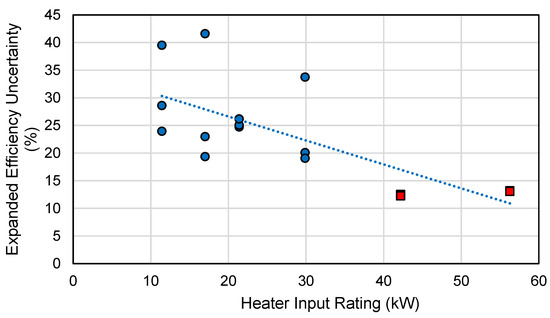Expanded thermal efficiency (y-axis) versus heater input rating (x-axis). The blue circles represent the measurements using the mass flow system, and the red squares represent the volumetric flow measurements.
