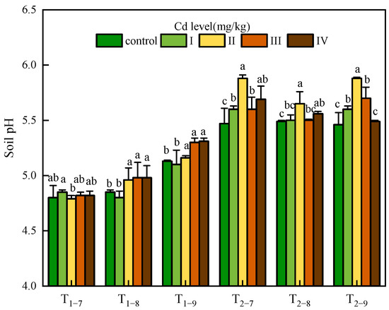 Soil pH under Cd treatment control, I, II, III and IV. Ti–j means soil sampled at a certain point (i = 1,2, represents the year after transplanting; j = 7,8,9, represents the month for sampling). Error bars indicate standard deviation calculated for three replicates. Significant effects of each treatment on values for soil pH are denoted by different lowercase letters (one-way analysis of variance (ANOVA), p < 0.05).