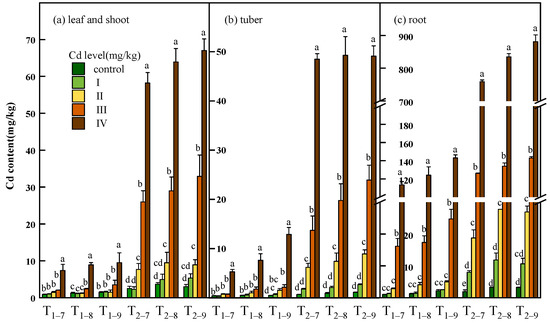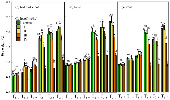 Dry weight of leaf and shoot (a), tuber (b) and root (c) of Bletilla striata (B. striata) plants under Cd treatment control, I, II, III and IV. Ti–j means B. striata harvested at a certain point (i = 1,2, represents the year after transplanting; j = 7,8,9, represents the month for sampling). Values demonstrate means ± SD (n = 3). Significant effects of each treatment on values for dry weight are denoted by different lowercase letters (one-way ANOVA, p < 0.05).