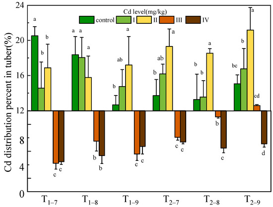 Cd distribution percent in tuber of B. striata plants under Cd treatment control, I, II, III and IV. Ti–j means Bletilla striata harvested at a certain point (i = 1,2, represents the year after transplanting; j = 7,8,9, represents the month for sampling). Error bars indicate standard deviation calculated for three replicates. Significant effects of each treatment on values for distribution percent are denoted by different lowercase letters (one-way ANOVA, p < 0.05).